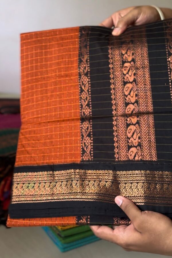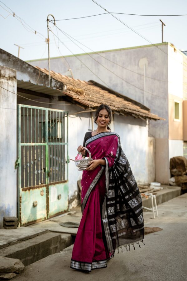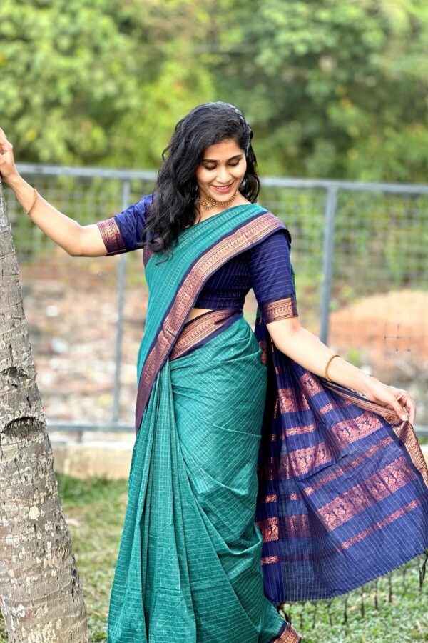 Looking for something that’s effortlessly elegant and super comfortable? This Kalyani Cotton saree might just be your new favorite. With its soft, breathable fabric and rich traditional weave, it’s perfect for everything from morning poojas to casual brunches. The bold contrast border with delicate zari work adds that festive pop without being too loud. Pair it with oxidized jewelry or a sleek bun and you’re good to go—simple, graceful, and totally timeless.