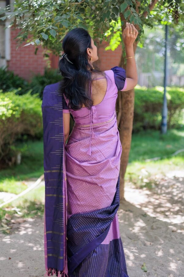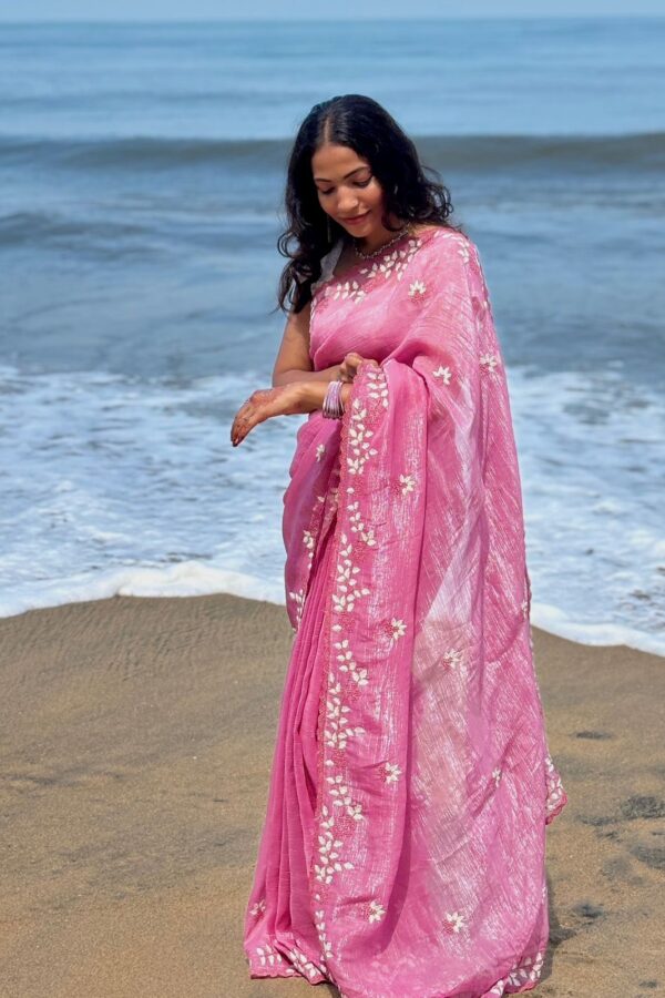 This pastel pink space silk saree comes with a soft sheen and a fluid drape that feels light and elegant on the body. Perfect for day events and graceful occasions